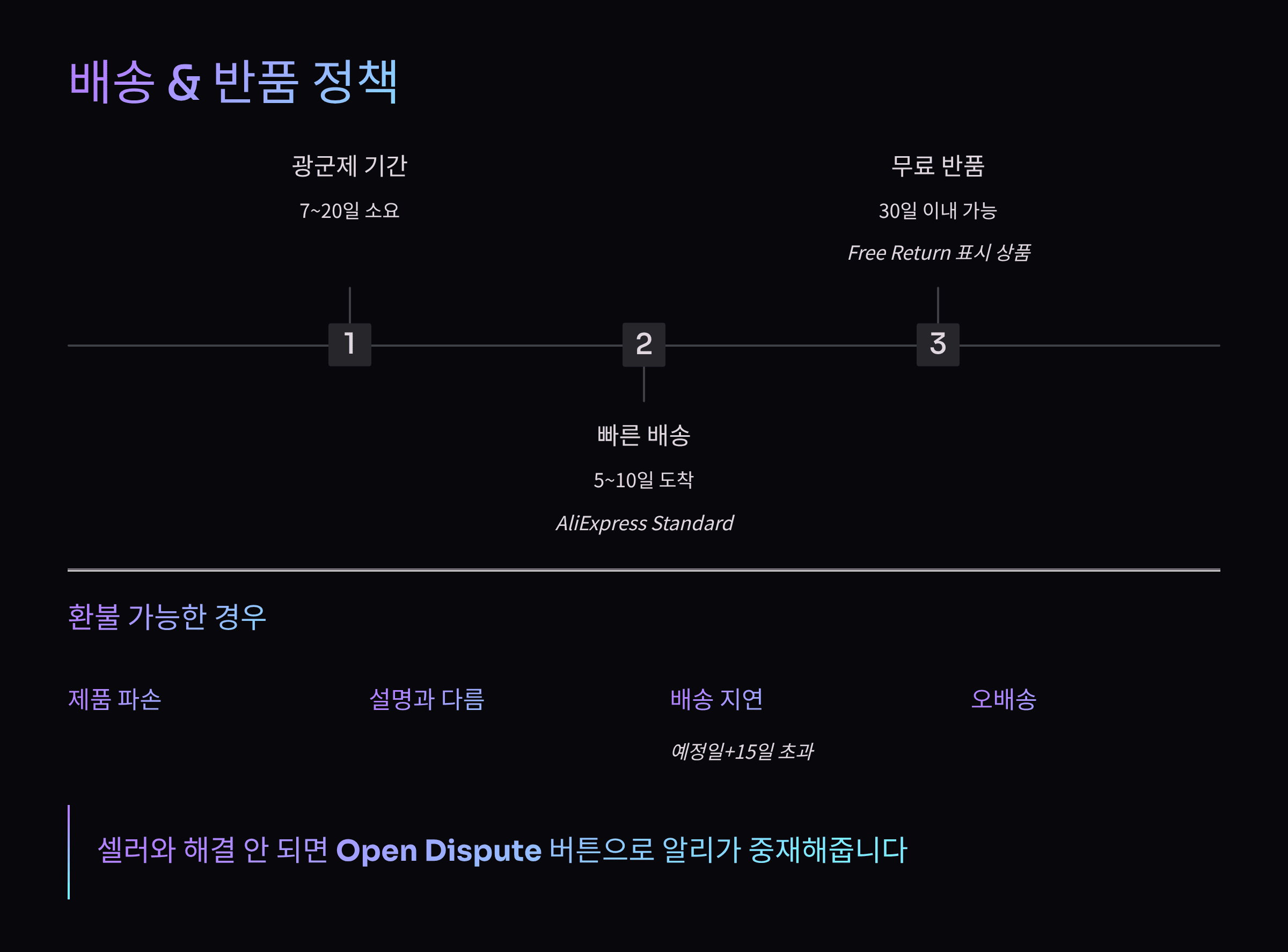 - 빠른 배송 옵션: 5~10일 도착 (AliExpress Saver/Standard Shipping)